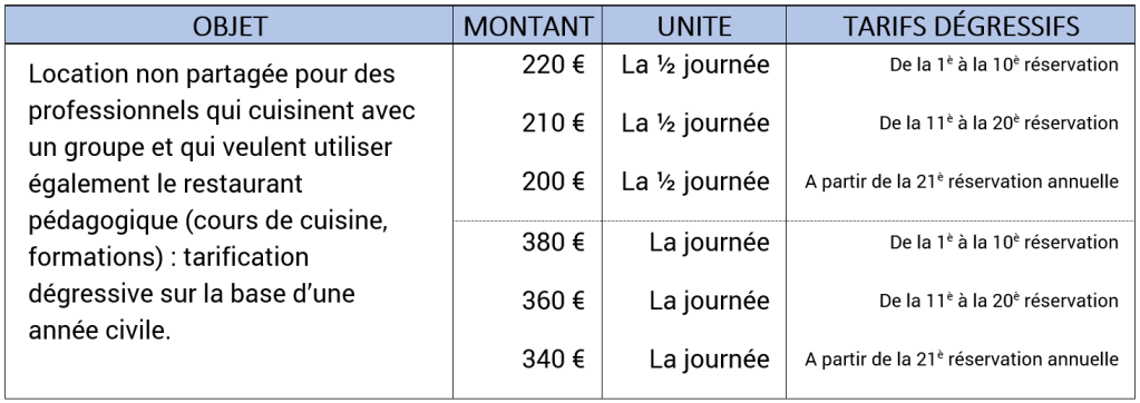 La cuisine et le restaurant pédagogique doivent être remis au propre par les locataires avant leur départ. Si après leur départ ces locaux sont jugés non conformes aux règles d’hygiène précisées dans la convention, un forfait de 100€ leur sera facturé en supplément pour une prestation ménage et au titre de dommages et intérêts.