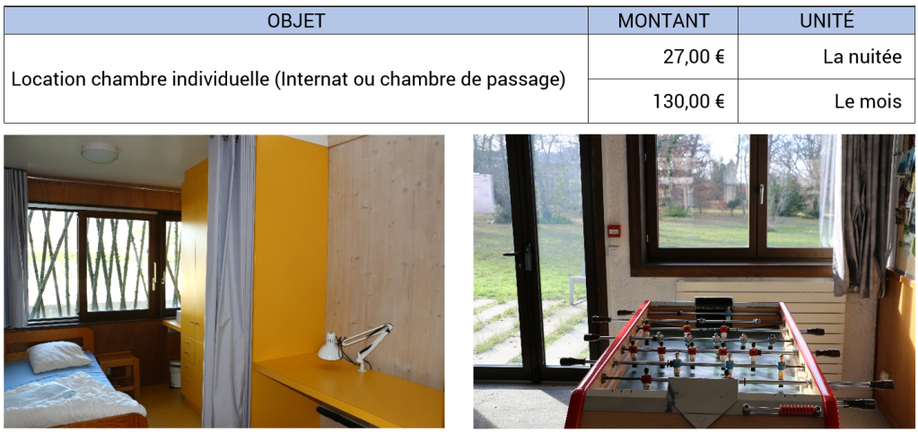 38 chambres individuelles d’internat sont disponibles à la location de groupes encadrés pendant les vacances scolaires de la zone A. Pour la location des internats, les repas doivent être organisés en extérieur, auprès de notre prestataire interne ou d’un fournisseur extérieur, traiteur ou autre. La prestation ménage est obligatoire. Des devis peuvent vous être fournis pour ces deux prestations.