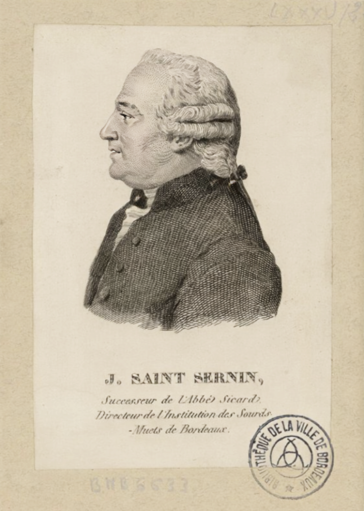 Suite à sa rencontre à Paris avec l’abbé de l’Epée, l’archevêque de Bordeaux Monseigneur Champion de Cicé décida d’établir une Institution pour les sourds-muets à Bordeaux en 1785. D’abord dirigé par l’abbé Sicard, jusqu’en 1790, l’école de Bordeaux ne dut pourtant sa pérennité qu’au dévouement de l’instituteur Jean Saint-Sernin, directeur de l’établissement de 1790 à 1814.